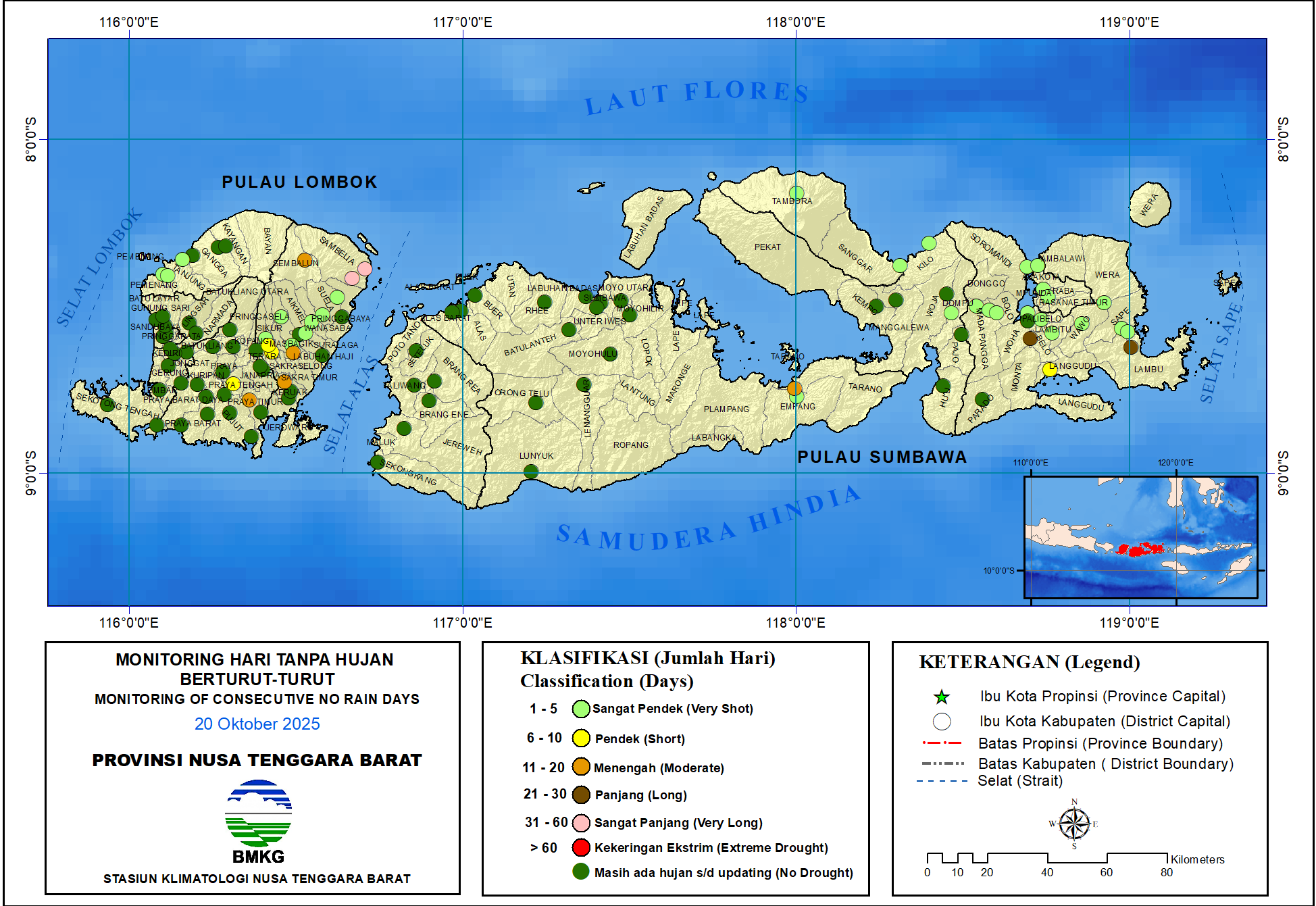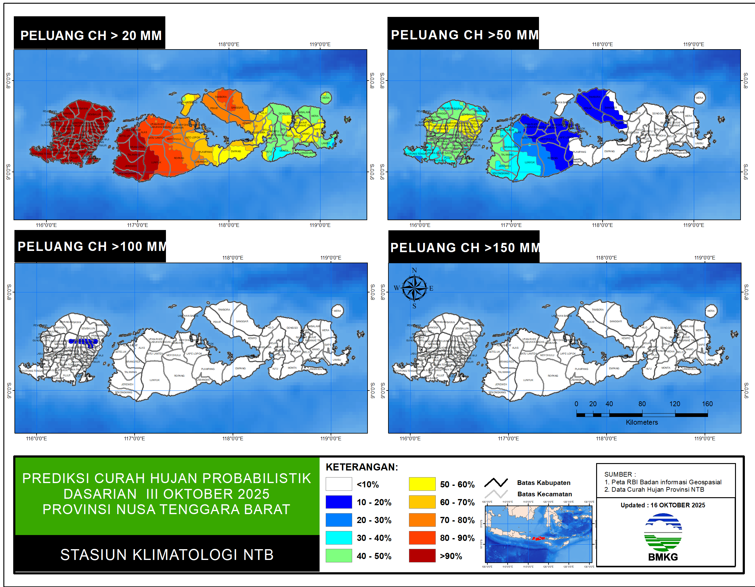 Pada dasarian III Oktober 2025 (21 - 31 Oktober), terdapat peluang terjadi hujan dengan intensitas >20 mm/dasarian sebesar >90% yang terjadi di Pulau Lombok, Kabupaten Sumbawa Barat. Untuk peluang 70% - 90% terjadi di sebagian besar wilayah Sumbawa bagian tengah dan Dompu bagian utara.