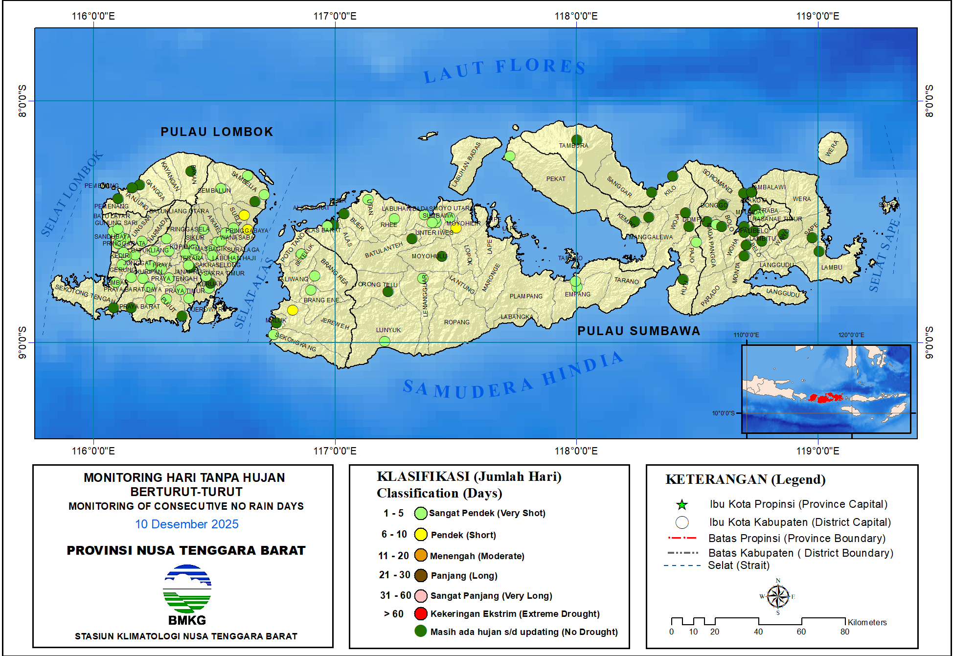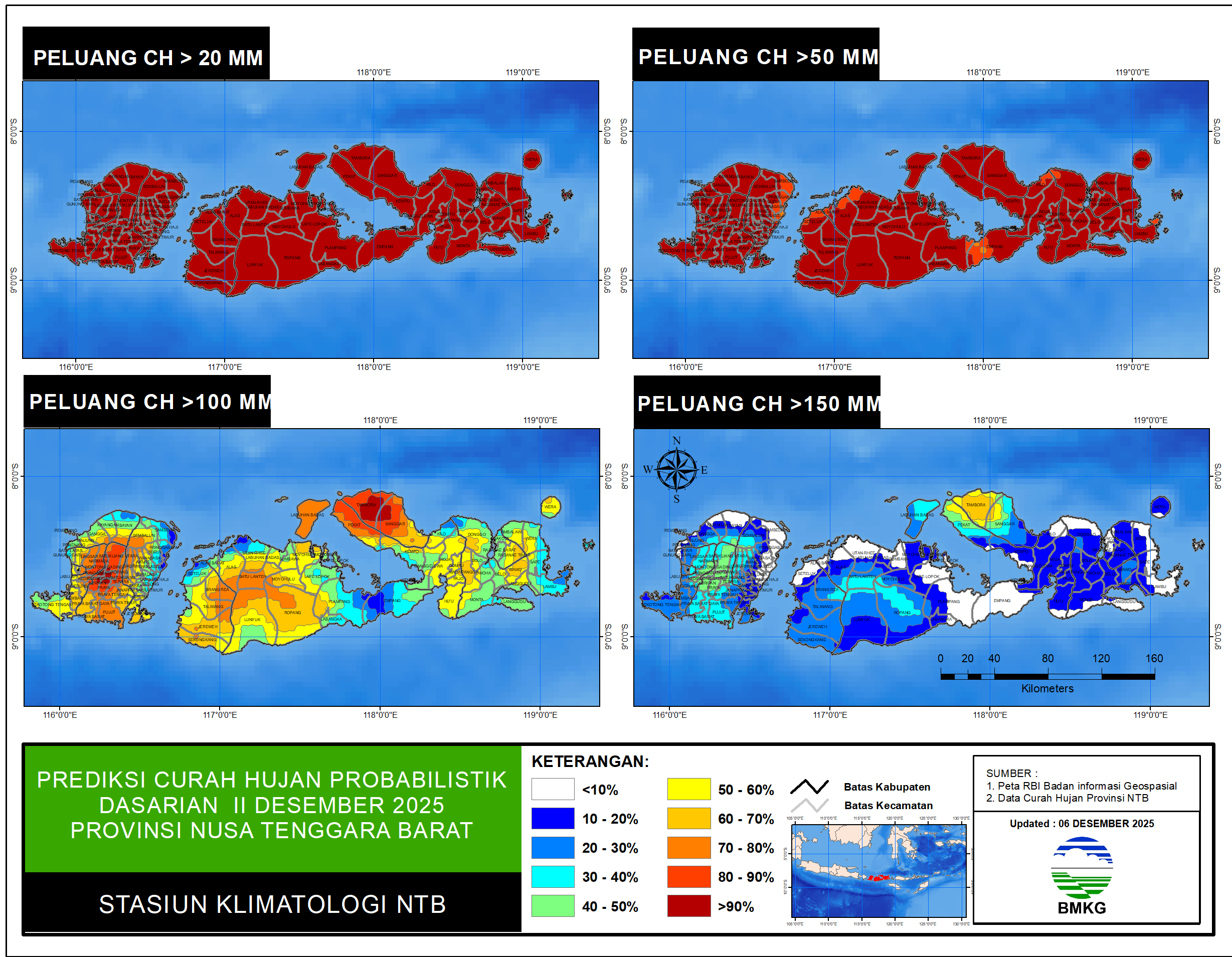Pada dasarian II Desember 2025 (11 - 20 Desember), terdapat peluang terjadi hujan dengan intensitas >50 mm/dasarian sebesar 70 - >90% yang terjadi di seluruh wilayah NTB. Kemudian, terdapat peluang terjadi hujan dengan intensitas >100mm/dasarian sebesar 70 - >90% yang terjadi di sebagian Kabupaten Lombok Barat, sebagian Kabupaten Lombok Timur, sebagian Kabupaten Lombok Tengah, sebagian Kabupaten Lombok Utara, sebagian Kabupaten Sumbawa Barat, sebagian Kabupaten Sumbawa, sebagian Kabupaten Bima, dan sebagian Kabupaten Dompu.