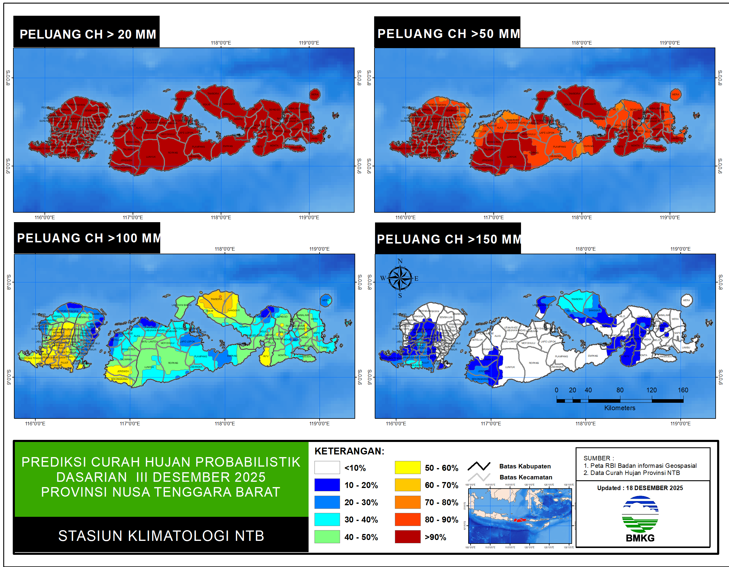 Pada dasarian III Desember 2025 (21 - 31 Desember), terdapat peluang terjadi hujan dengan intensitas >50 mm/dasarian sebesar >70% yang terjadi di seluruh wilayah NTB. Kemudian, terdapat peluang terjadi hujan dengan intensitas >100mm/dasarian sebesar 30 - 70% yang terjadi di sebagian besar Pulau Lombok, sedangkan sebagian besar Pulau Sumbawa memiliki peluang 30 – 80%. Curah hujan dengan intensitas >150mm/dasarian terjadi di seluruh Kab. Lombok Tengah, sebagian besar Kab. Lombok Barat, Kab. Sumbawa Barat, Kab. Dompu, Kab. Bima, serta sebagian kecil Kota Mataram dan Kota Bima.